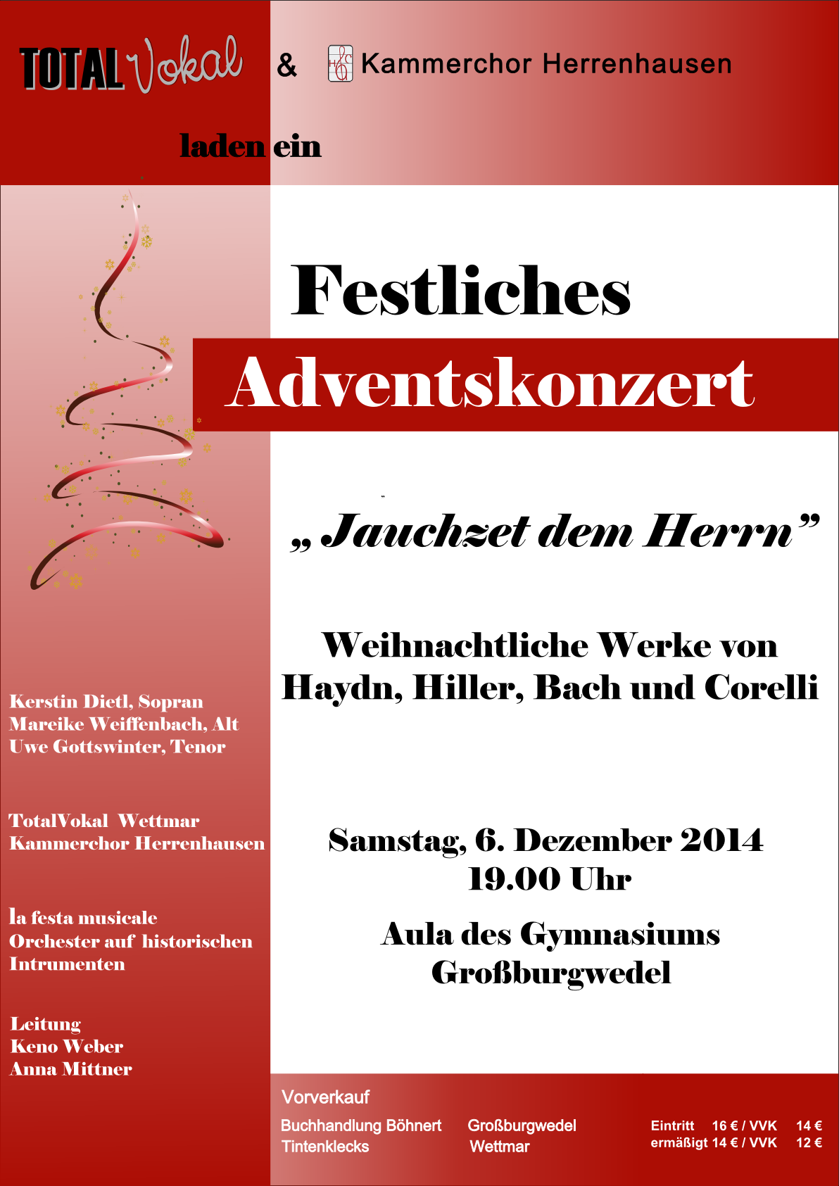 Mögen die Musikgeschmäcker auch noch so unterschiedlich sein – in der Vorweihnachtszeit darf es gerne festlich und klassisch zugehen. Am 6. Dezember um 19 Uhr konzertieren der Kammerchor Herrenhausen und TotalVokal aus Wettmar in der Aula des Gymnasiums Großburgwedel und am 7.Dezember um 17.00 Uhr in der Herrenhäuser Kirche. Das Konzert „Jauchzet dem Herrn“ bietet weihnachtliche Werke von Haydn, Hiller, Bach und Corelli unter Mitwirkung des Orchesters „la festa musicale“, das auf historischen Instrumenten spielt.