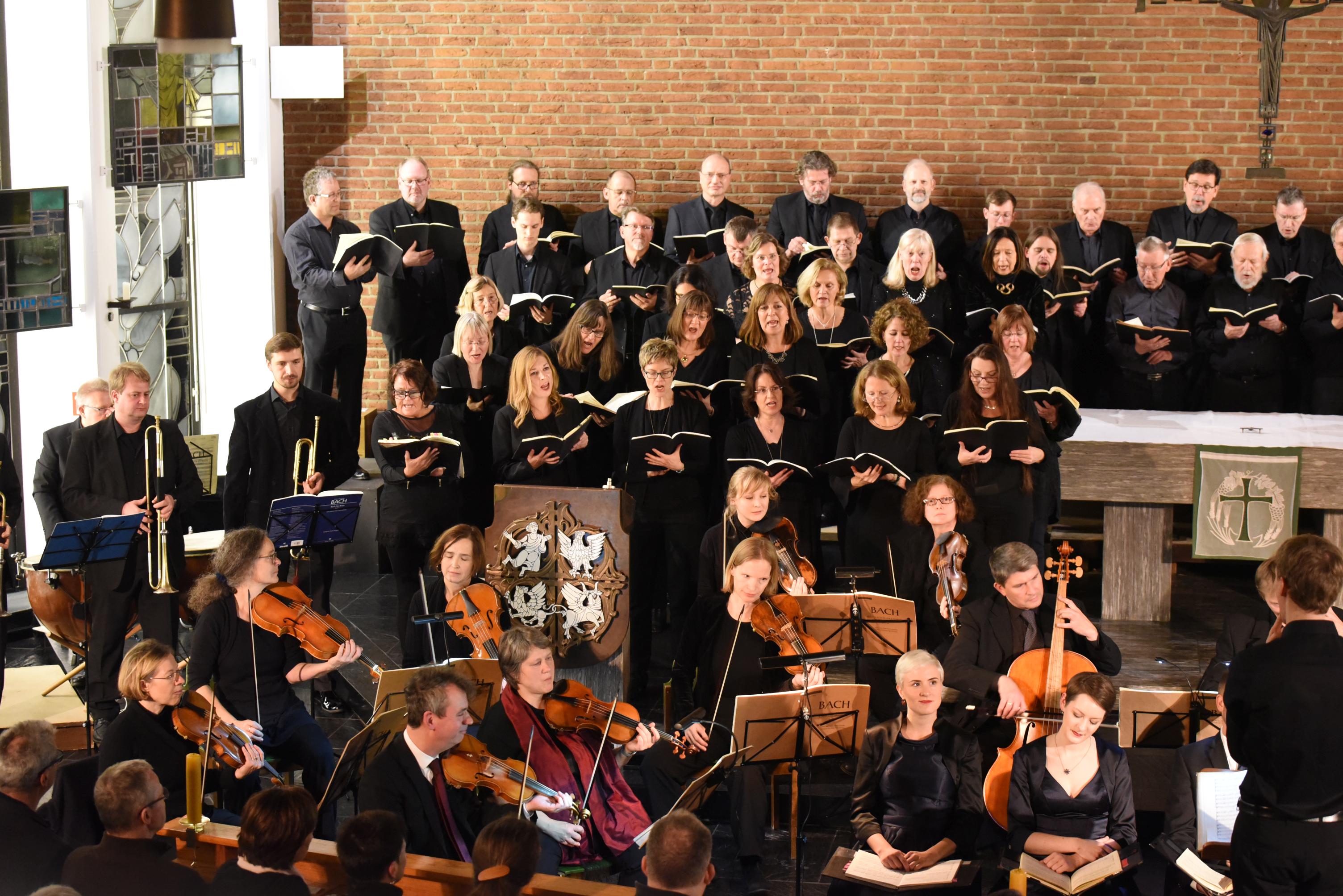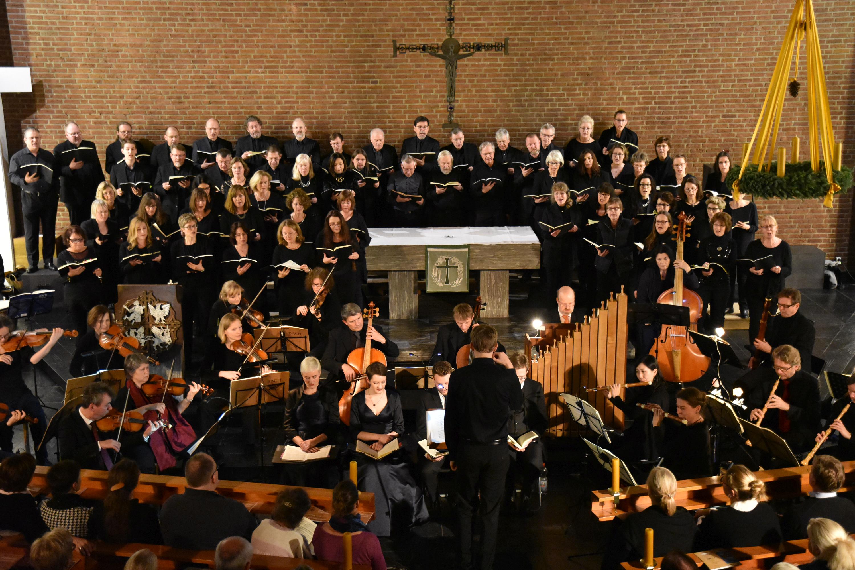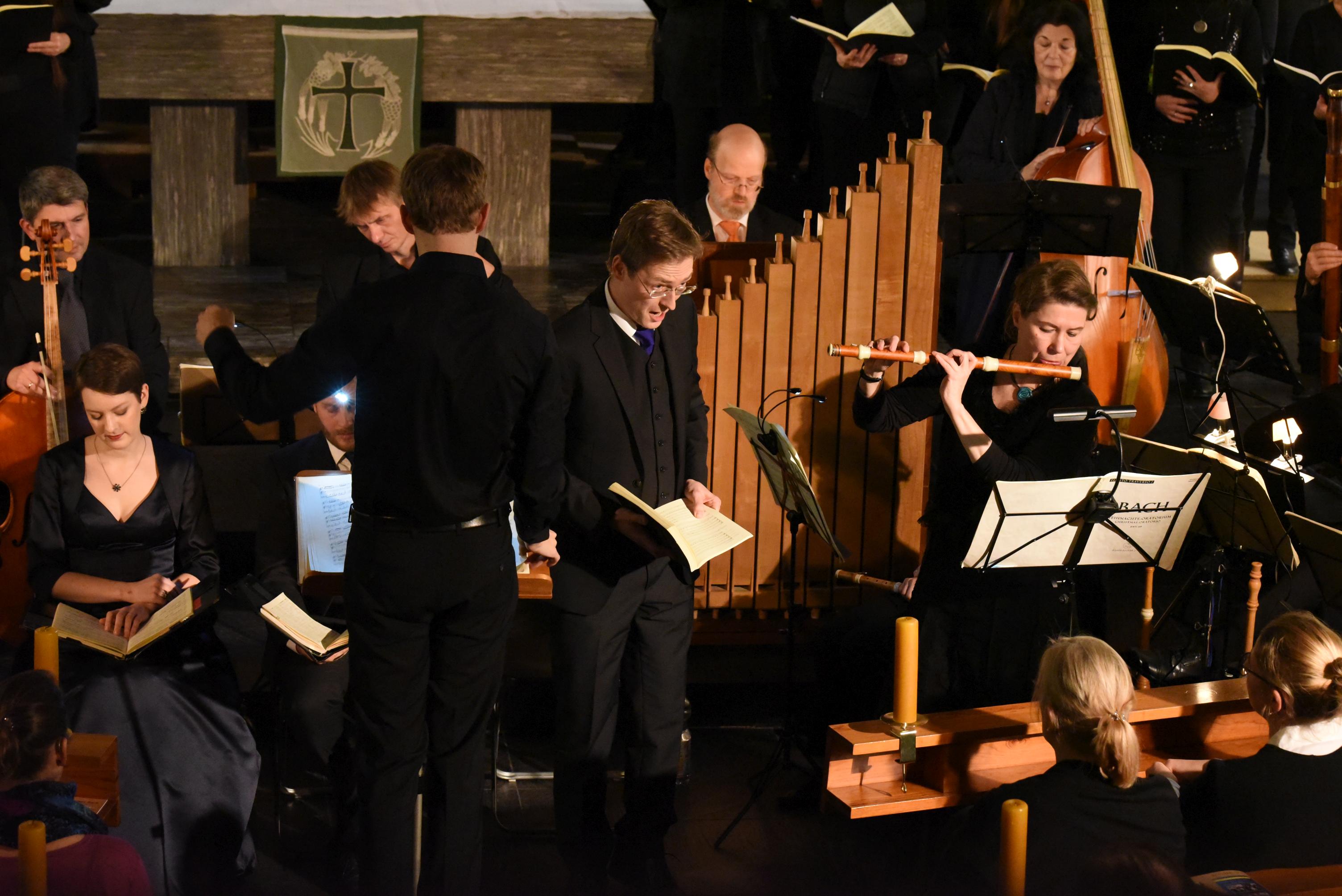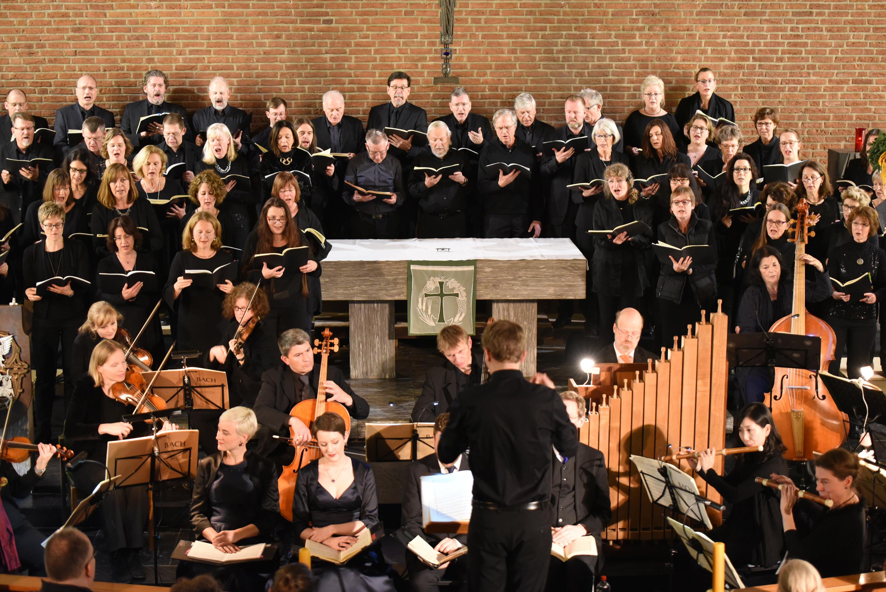 Sie zeigen die Totale in der ausverkauften katholischen Kirche, die Stimmgruppen und das Orchester. Außerdem gibt es ausdrucksstarke Momentaufnahmen von den wunderbaren Solistinnen Sophia Körber (Sopran) und Anna Schaumlöffel (Alt) sowie von Solist Steffen Henning (Bass) und von Florian Lohmann in der Rolle des Evangelisten, der die Rezitative vortrug.