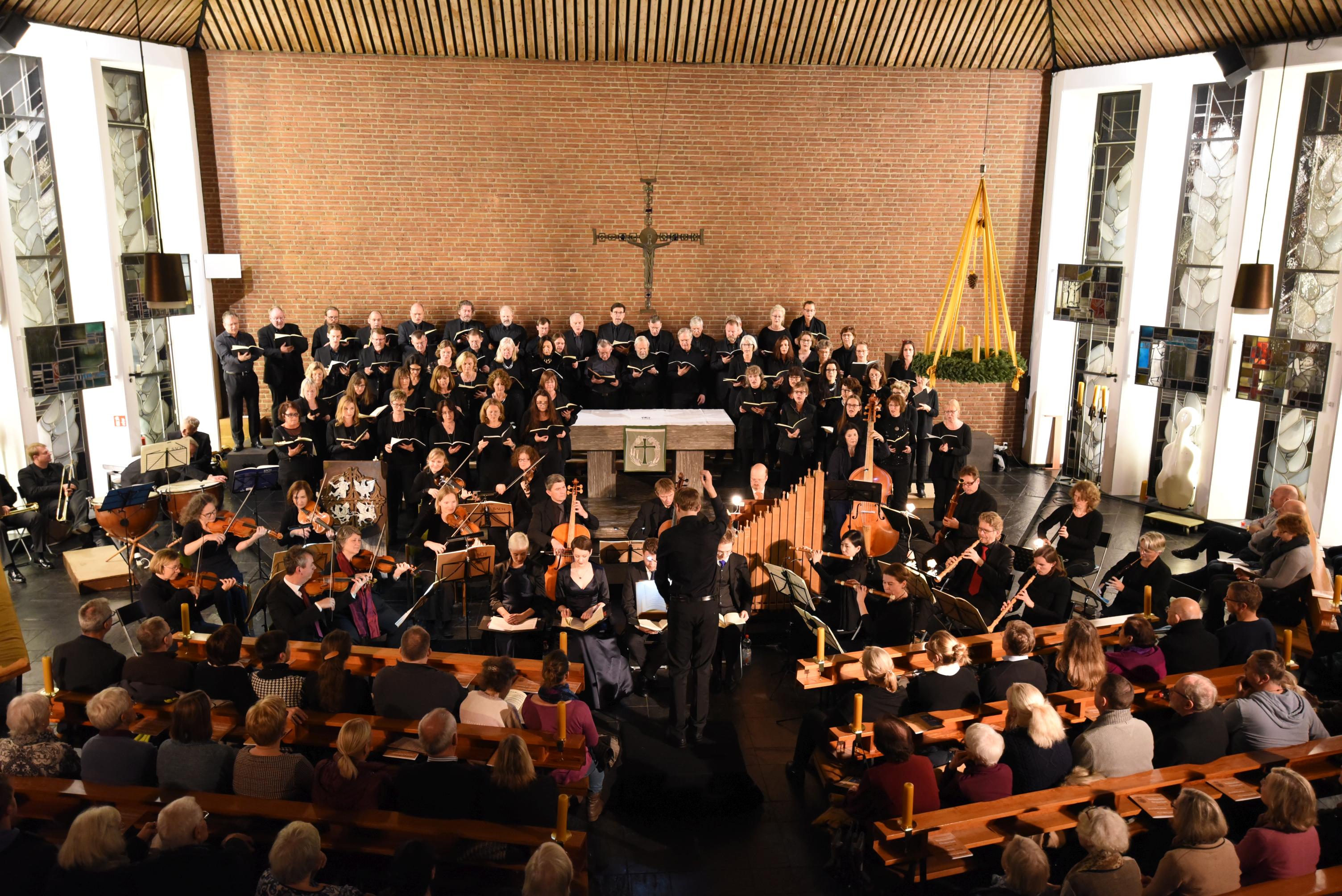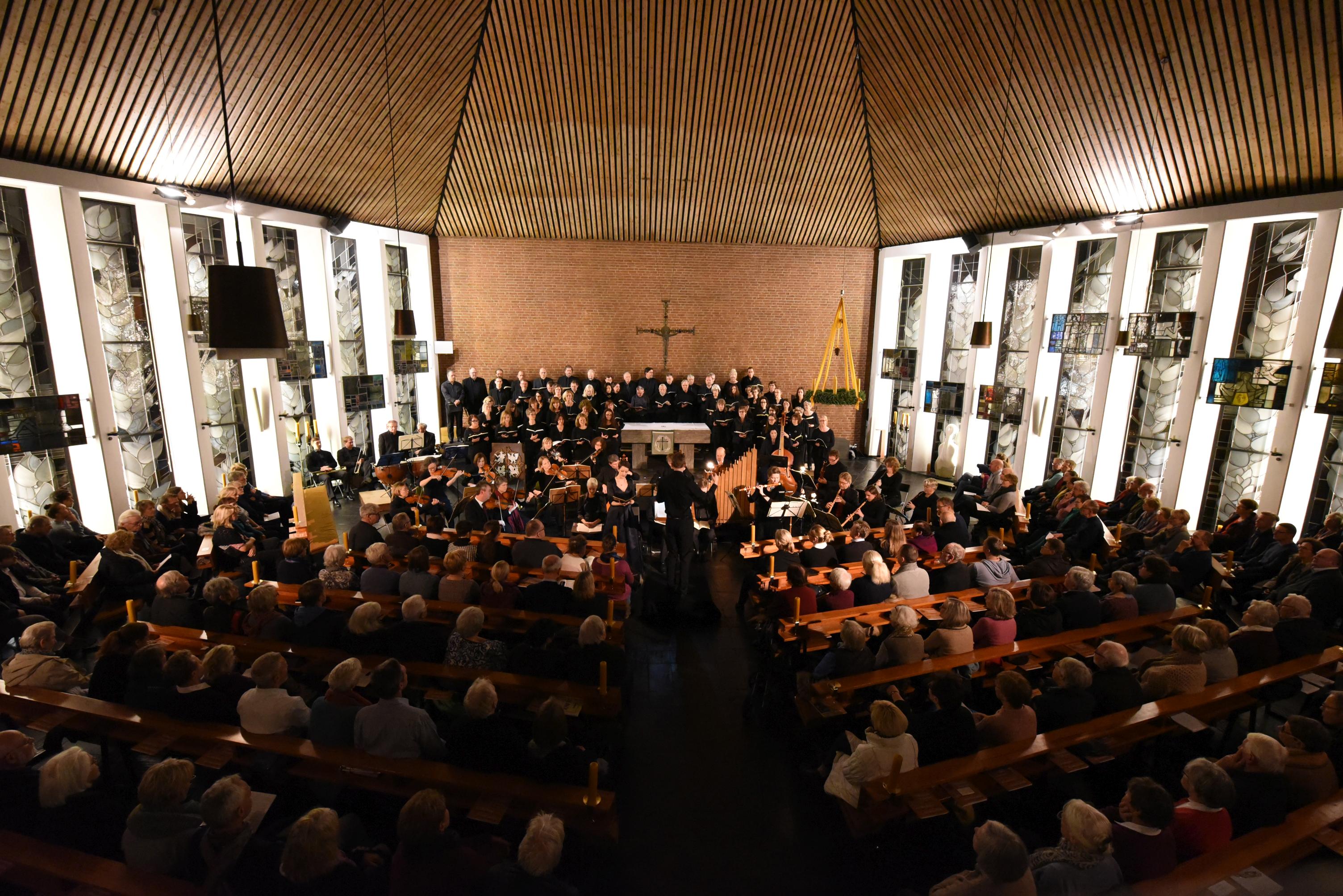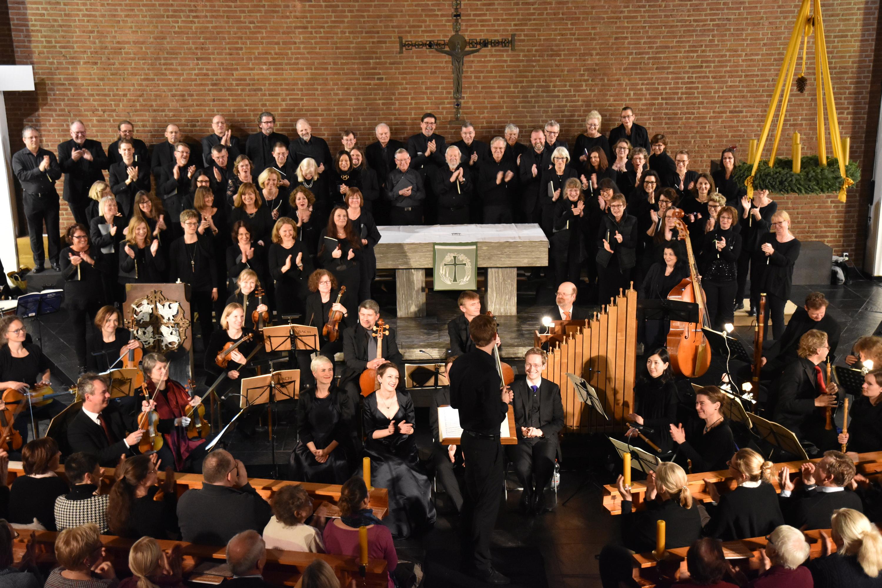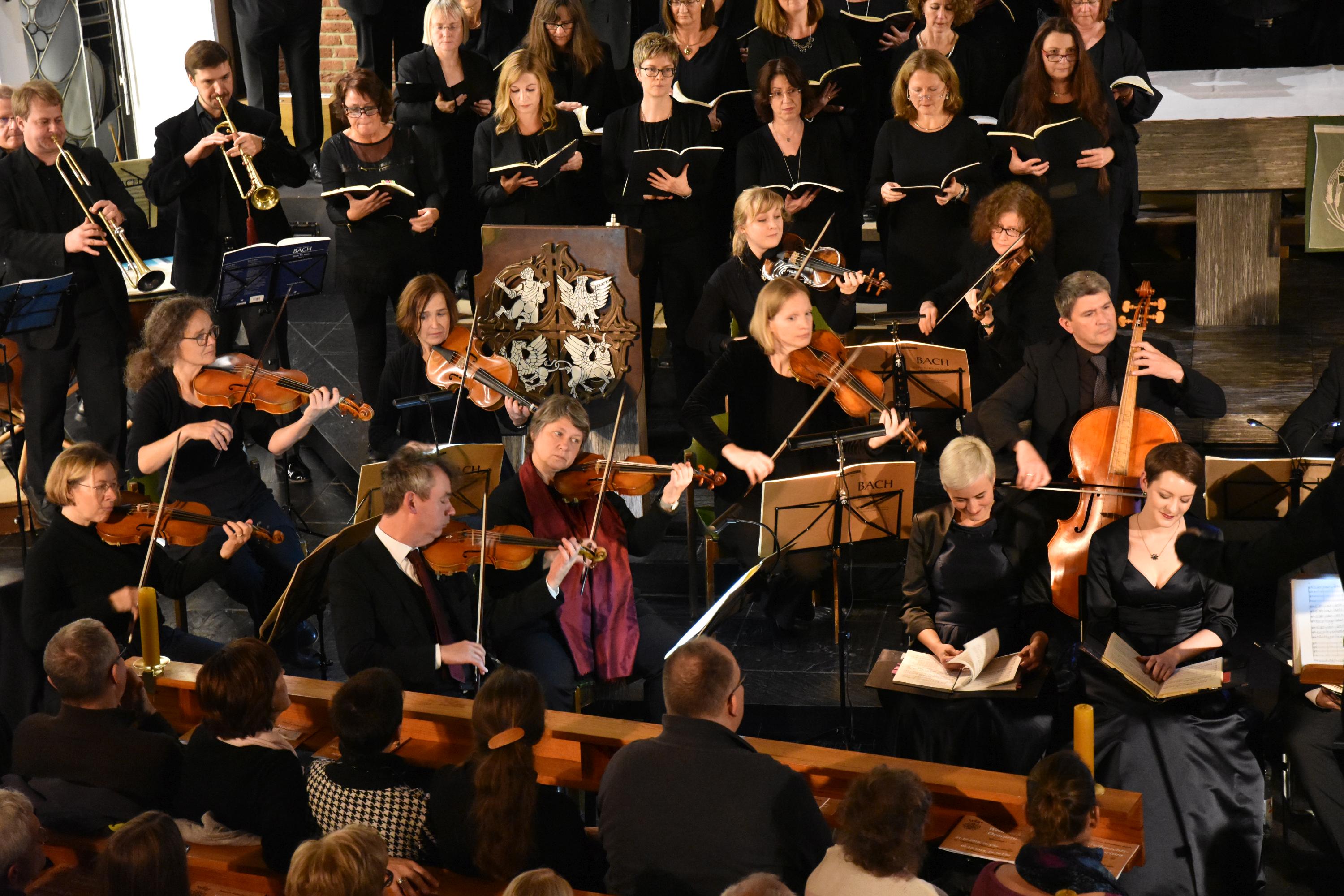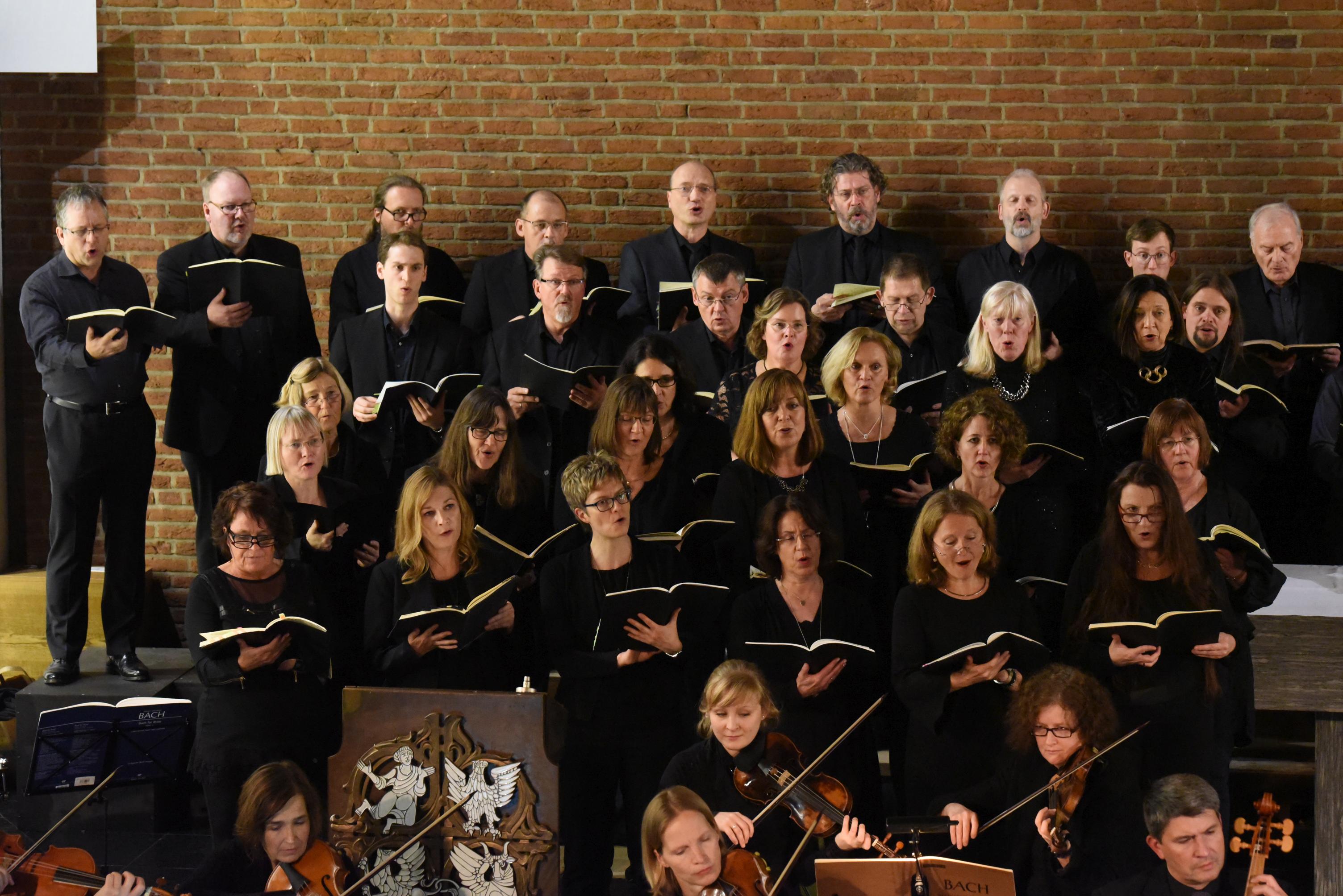 Sie zeigen die Totale in der ausverkauften katholischen Kirche, die Stimmgruppen und das Orchester. Außerdem gibt es ausdrucksstarke Momentaufnahmen von den wunderbaren Solistinnen Sophia Körber (Sopran) und Anna Schaumlöffel (Alt) sowie von Solist Steffen Henning (Bass) und von Florian Lohmann in der Rolle des Evangelisten, der die Rezitative vortrug.