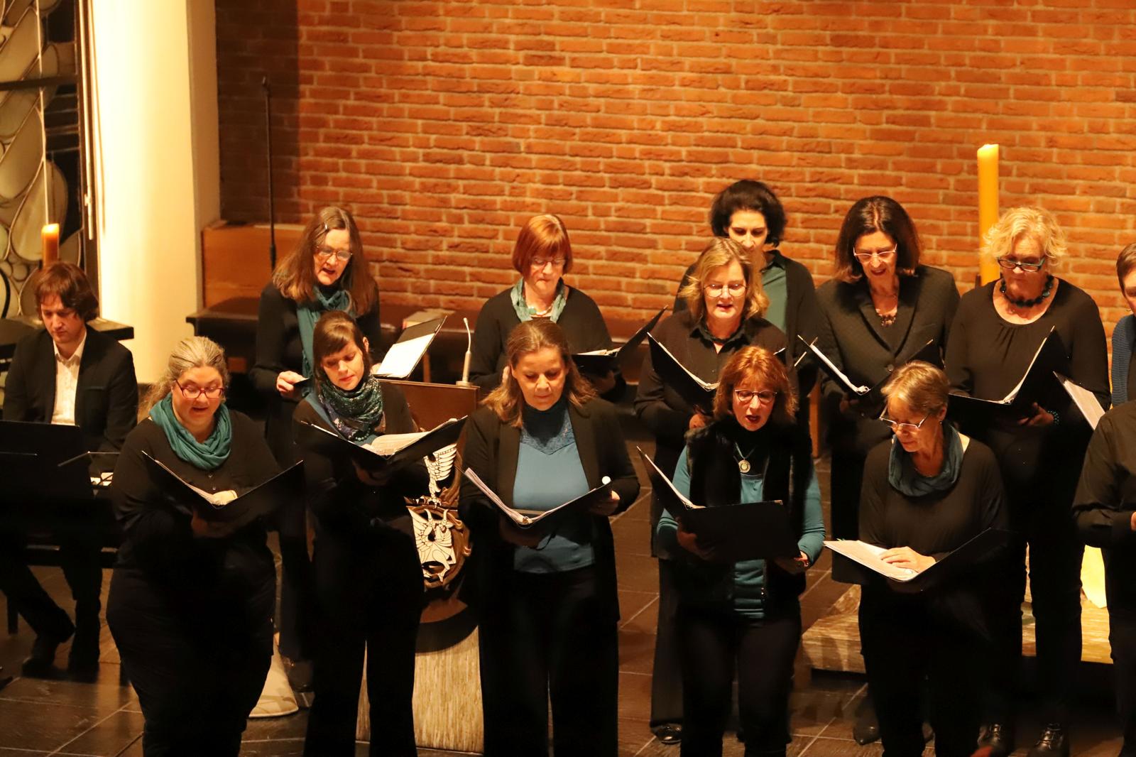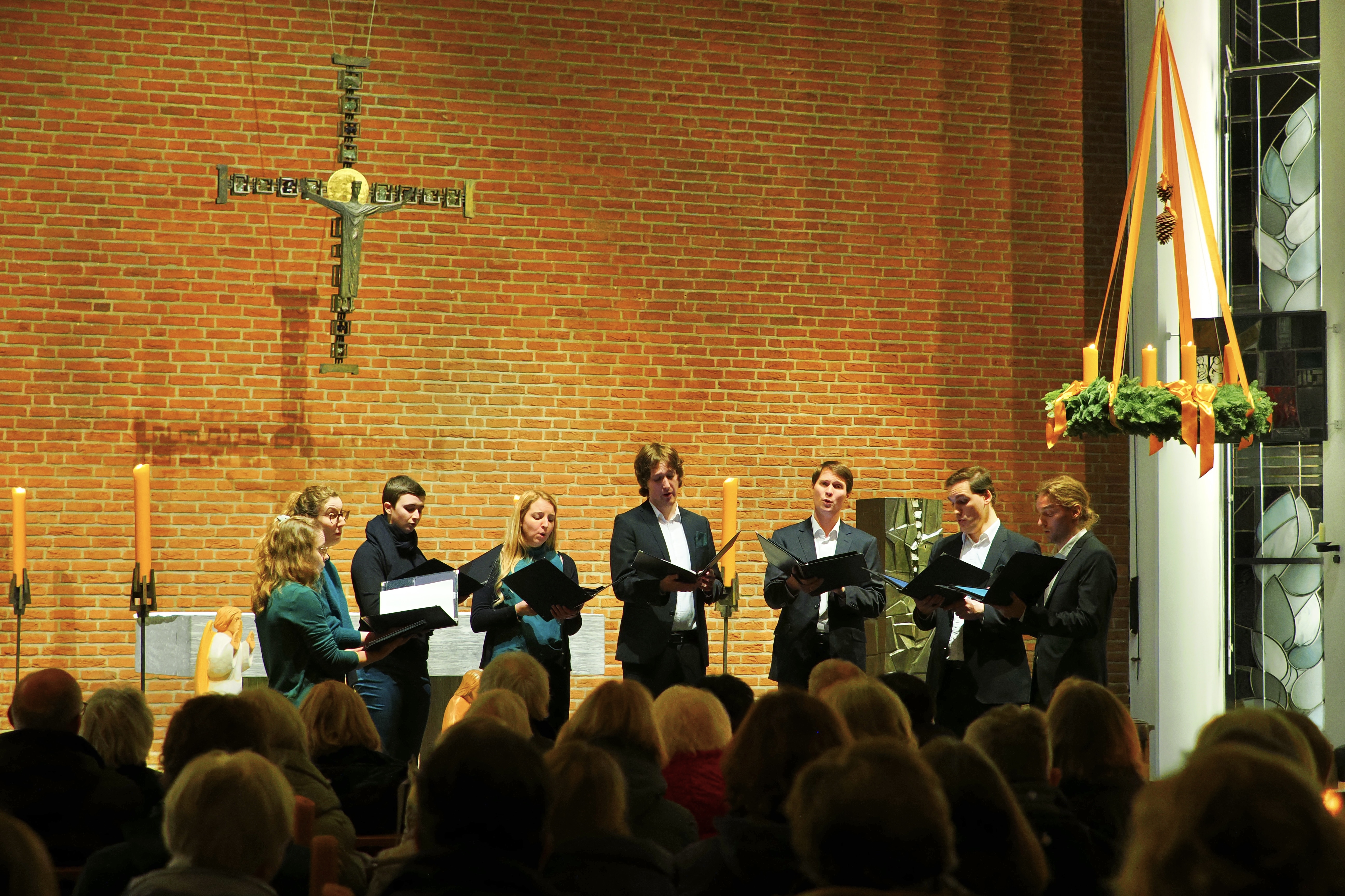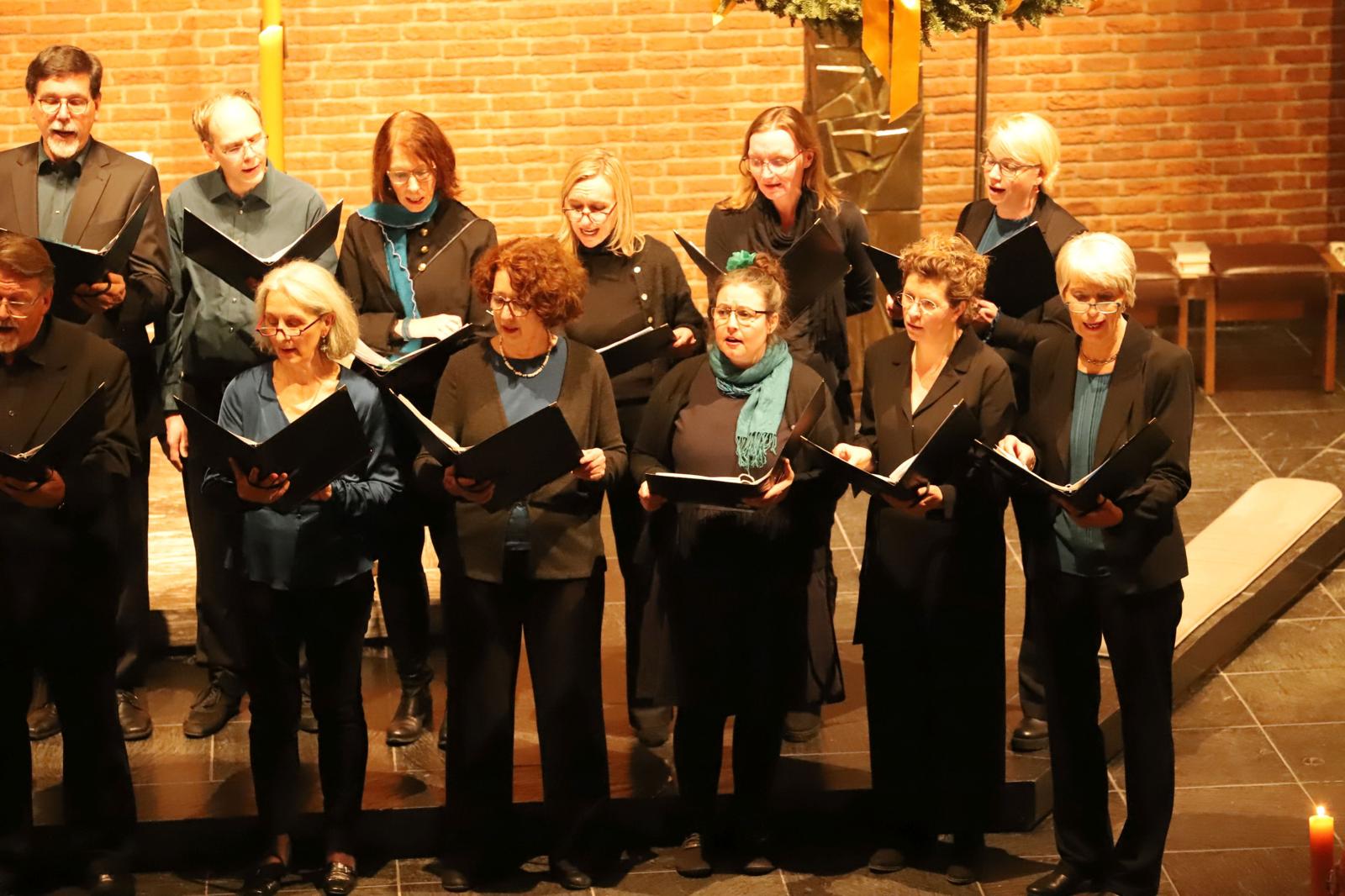 Das gemeinsame Konzert hat inzwischen schon eine kleine Tradition, bereits zum 3. Mal bestritten die beiden Ensembles den gemeinsamen Auftritt zur Weihnachtszeit. Silas Bredemeier als Chorleiter von Total Vokal gehört dem Ensemble Vox Spiritus an und hatte damals die Idee zu dem Konzerttandem. Die Auswahl der Lieder und das Dirigat für TotalVokal hat in diesem Jahr Johanna Gronemann übernommen, ebenfalls Mitglied von Vox Spiritus. Gronemann hat ein Auslandssemester in Schweden absolviert und so hauchte sie mit „Jul Jul, strolande Jul“ dem Konzert einen skandinavischen Touch ein. Mit klassischen Stücken wie „Maria durch ein Dornwald ging“ oder „Tochter Zion“ als Einladung zum Mitsingen an die Gäste und einem Repertoire mit „Jingle Bells“, „Night of silence“ oder „Deck the halls“ bot TotalVokal eine internationale Mischung an Weihnachtsmusik. Zum Teil wurde der Chor mit Fabian Krämer am Piano, Maria Ravvina an der Geige und Brigitte Chrzanowski an der Flöte begleitet. Den lyrischen Song „A world for christmas“ intonierten die beiden Ensembles gemeinsam und leiteten damit zum zweiten Part des Abends mit Vox Spiritus über.