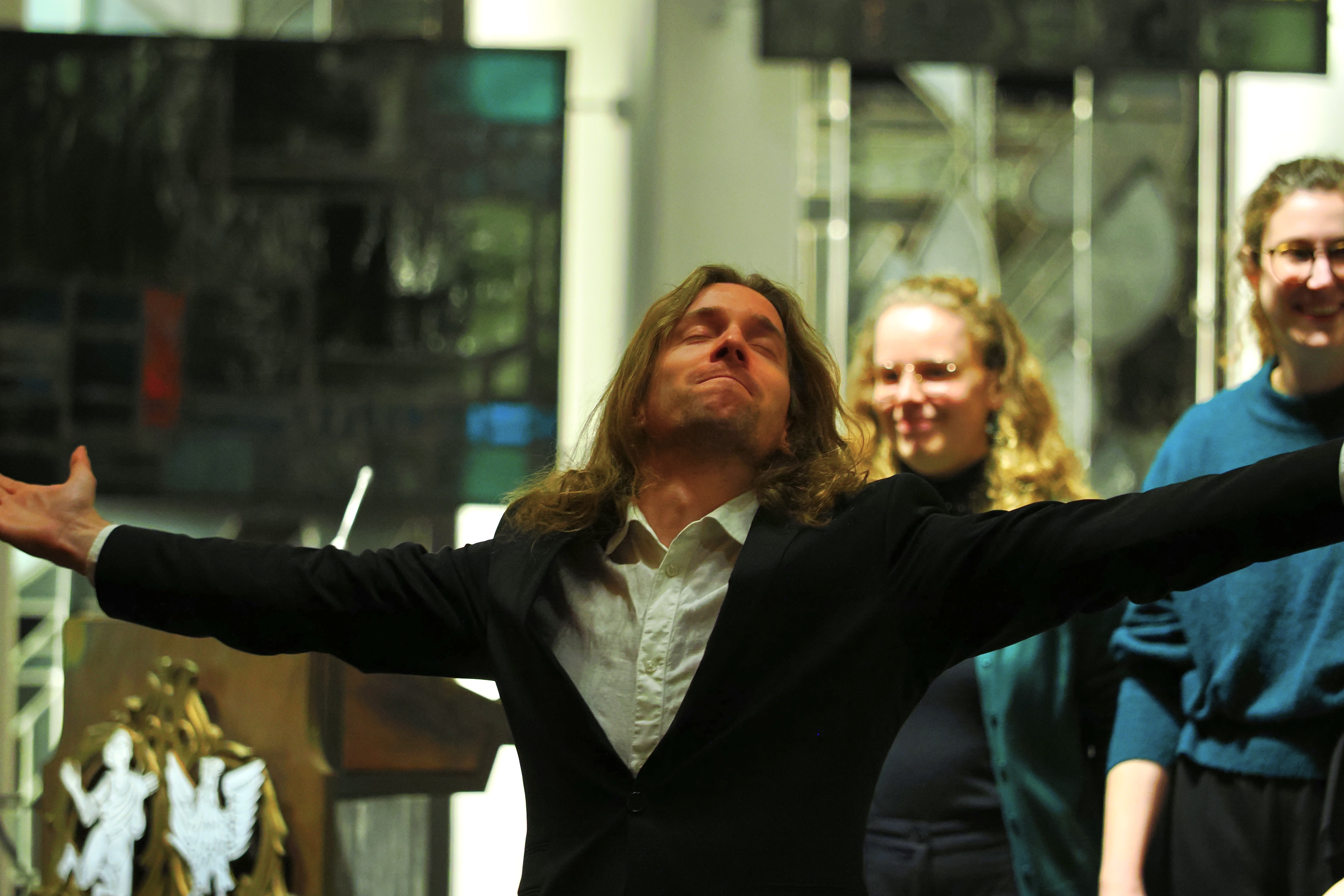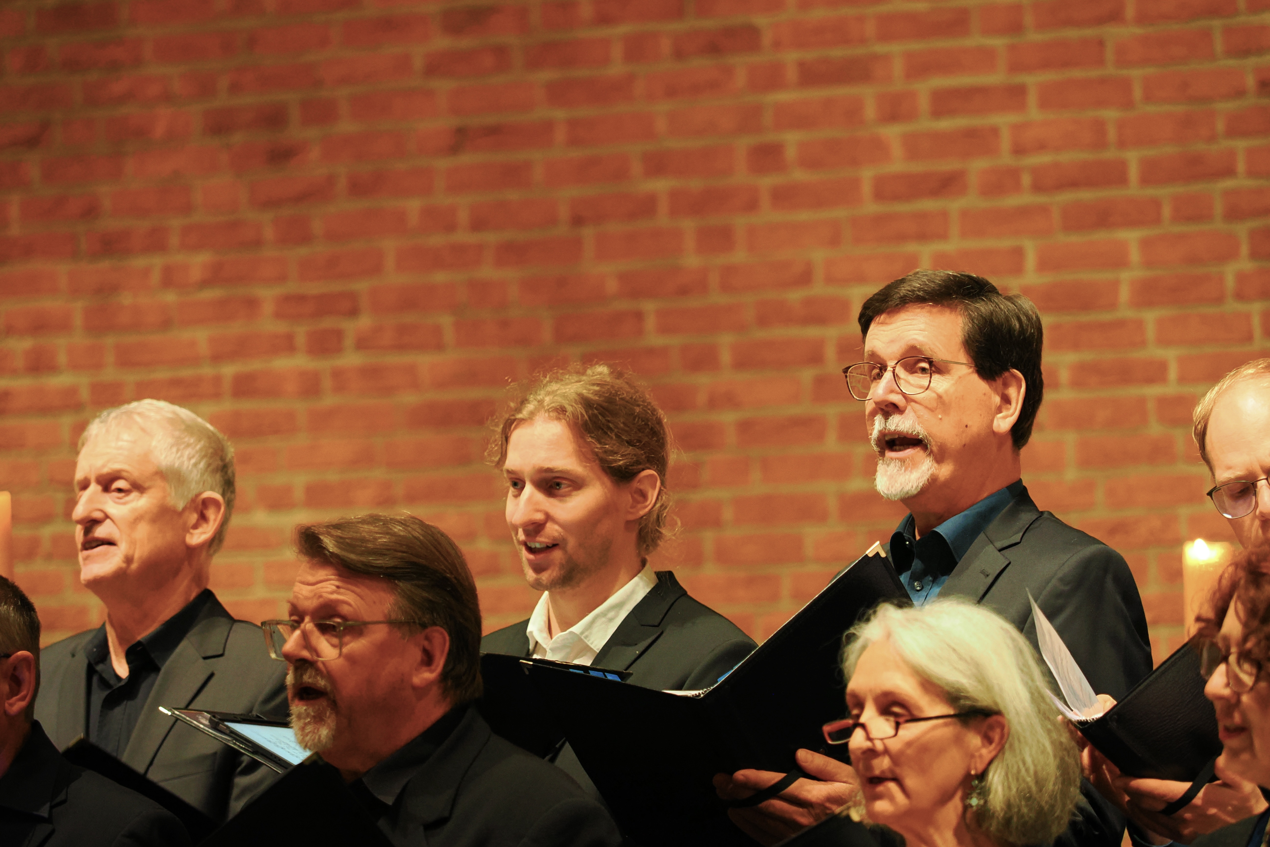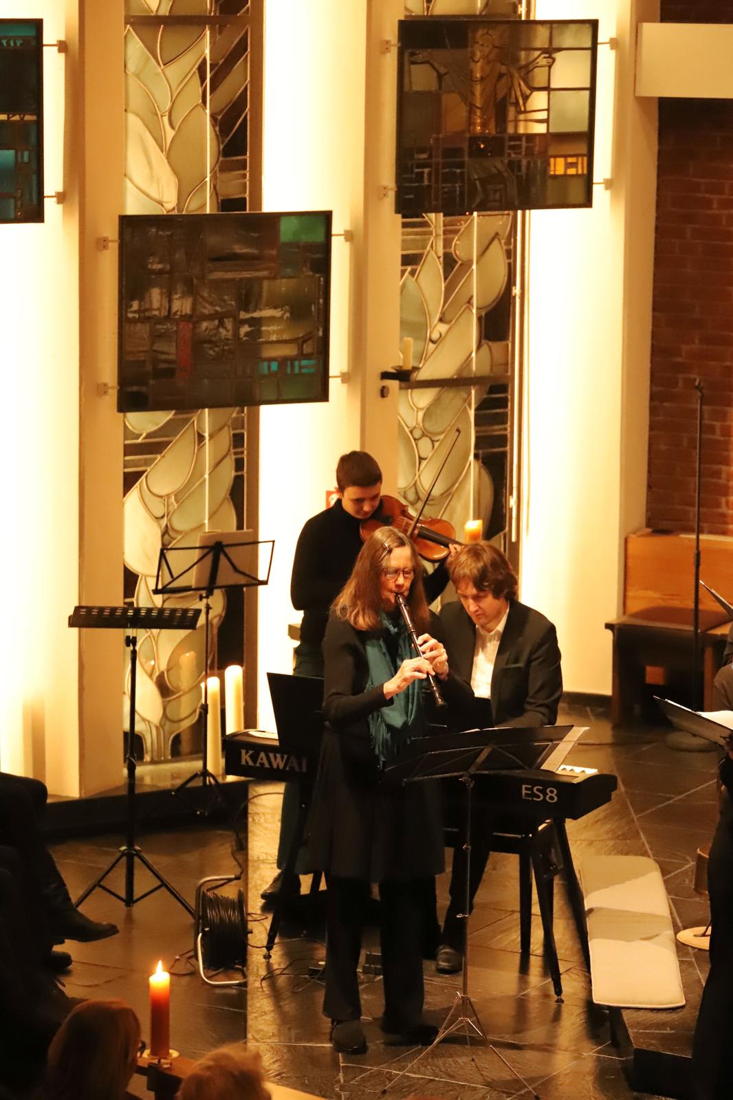 Das gemeinsame Konzert hat inzwischen schon eine kleine Tradition, bereits zum 3. Mal bestritten die beiden Ensembles den gemeinsamen Auftritt zur Weihnachtszeit. Silas Bredemeier als Chorleiter von Total Vokal gehört dem Ensemble Vox Spiritus an und hatte damals die Idee zu dem Konzerttandem. Die Auswahl der Lieder und das Dirigat für TotalVokal hat in diesem Jahr Johanna Gronemann übernommen, ebenfalls Mitglied von Vox Spiritus. Gronemann hat ein Auslandssemester in Schweden absolviert und so hauchte sie mit „Jul Jul, strolande Jul“ dem Konzert einen skandinavischen Touch ein. Mit klassischen Stücken wie „Maria durch ein Dornwald ging“ oder „Tochter Zion“ als Einladung zum Mitsingen an die Gäste und einem Repertoire mit „Jingle Bells“, „Night of silence“ oder „Deck the halls“ bot TotalVokal eine internationale Mischung an Weihnachtsmusik. Zum Teil wurde der Chor mit Fabian Krämer am Piano, Maria Ravvina an der Geige und Brigitte Chrzanowski an der Flöte begleitet. Den lyrischen Song „A world for christmas“ intonierten die beiden Ensembles gemeinsam und leiteten damit zum zweiten Part des Abends mit Vox Spiritus über.